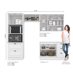 FICHA TECNICA: Cor Interna: Trama Branco Acabamento: Pintura UV Escala de Brilho: Fosco Material do Fundo: MDF Material Principal: MDF Qtd. Gavetas: 05 Peso Maximo por Gaveta: 03 Kg Material do Puxador Gaveta: Metal Zamac Material da Corredica: Metalica Telescopica Material da Gaveta: MDF Qtd. Portas: 08 Material da Dobradica: Metalica Material do Puxador Porta: Metal Zamac Tipo Porta: 07 De Dobradica, e 01 Basculante Qtd. Prateleiras: 06 Peso Maximo por Prateleira: 8 Kg Material da Prateleira: MDF Qtd. Pes: Nao possui, apenas rodape Altura Pes/Rodapes: 14,5 Cm Balcao Acompanha Pia: Nao Tamanho Indicado da Pia: 120cm x 52cm Acompanha Tampo: Nao Produto Suporte ate -Kg-: 161 Kg Medidas Conjunto Montado: 220,5 x 271,5 x 51 Cm Peso Conjunto Montado: 149 Kg