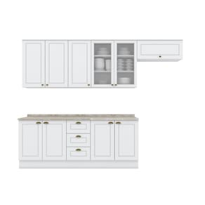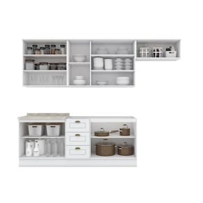 FICHA TECNICA: Cor Interna: Trama Branco Acabamento: Pintura UV Escala de Brilho: Fosco Material do Fundo: MDF Material Principal: MDF Qtd. Gavetas: 03 Peso Maximo por Gaveta: 03 Kg Material do Puxador Gaveta: Metal Zamac Material da Corredica: Metalica Telescopica Material da Gaveta: MDF Qtd. Portas: 10 Material da Dobradica: Metalica Material do Puxador Porta: Metal Zamac Tipo Porta: 09 de Dobradica e 01 Basculante Qtd. Prateleiras: 07 Peso Maximo por Prateleira: 8 Kg Material da Prateleira: MDF Qtd. Pes: Nao possui, apenas rodape Altura Pes/Rodapes: 14,5 Cm Balcao Acompanha Pia: Nao Tamanho Indicado da Pia: 120cm x 52cm Acompanha Tampo: Sim Material do Tampo: BP Produto Suporte ate -Kg-: 265 Kg Tampo possui recorte p/Cooktop: Nao Medidas Conjunto Montado: 220,5 x 280 x 51 Cm Peso Conjunto Montado: 149,5 Kg
