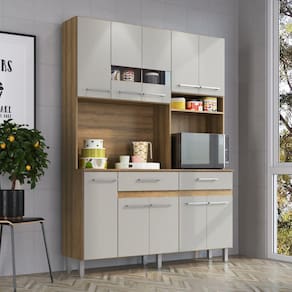 Deixe a sua cozinha mais completa com o Kit Cozinha 611 Casamia de 10 portas e 2 gavetas. O móvel tem a qualidade da estrutura em MDP, com a pintura em impressão. Além do design moderno, os compartimentos são excelentes. O modelo ainda conta com espaço para forno ou micro-ondas. Garanta já a sua! Acabamento da Prateleira: Finish Foil Escala de Brilho da Prateleira: Fosco Acabamento da Gaveta: Pintura Escala de Brilho da Gaveta: Fosco Material do Puxador da Gaveta: ABS Acabamento da Porta: Pintura Escala de Brilho da Porta: Fosco Material do Puxador da Porta: ABS Acabamento dos Pés: Polipropileno Acompanha Tampo: Não Altura dos Pés: 13 cm Ambiente Principal: Cozinha Complexidade da Montagem: Média: pode ser montado por mais de uma pessoa e/ou necessite de maior conhecimento para montagem Cor: Teka/Off White Cor do Produto: Teka/Off White Cor Interna: Teka Escala de Brilho: Fosco Gaveta com Chave: Não Itens Inclusos: 1 Cozinha Compacta, Kit Ferragens e Manual de Montagem Linha ou Coleção: Linha 600 Manual de Montagem e Instalação: https://cdn2.madeiramadeira.com.br/atributo/casamia/983339-611-kit-cozinha-2150-manual-de-montagem.pdf Material da Gaveta: MDP Material da Porta: MDP Material da Prateleira: MDP Material do Fundo: HDF Material dos Pés: Polipropileno Montagem Flex: Não Necessita Montagem: Sim O Balcão Acompanha Pia: Não Origem do Produto: Nacional Pés Reguláveis: Sim Peso: 67,2 kg Peso Máximo por Gaveta: 2 kg Peso Máximo por Prateleira: 3kg Possui Pés: 06 Possui Portas: 10 Possui Prateleiras: 02 Possui recorte para Cooktop: Não Possui Rodízio: Não Recomendações de Uso, Manutenção e Limpeza: Pano limpo e macio, isento de impurezas, seco ou levemente umedecido com água e sabão neutro, bem torcido até que não saia gotas de água. Não devem ser utilizados abrasivos como palha de aço e objetos cortantes. Para remoção de manchas, utilizar pano levemente umedecido com solução de álcool e água em partes iguais. Fonte: Associação Brasileira da Indústria de Painéis de Madeira - ABIPA Sapatas Niveladoras: Sim Sistema de Montagem: Parafusos e Cavilhas Tipo de Corrediça da Gaveta: Metálica Simples Tipo de Dobradiça da Porta: Metálica Tipo de Puxador da Gaveta: Externo Tipo de Puxador da Porta: Externo