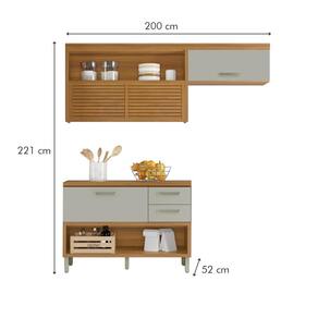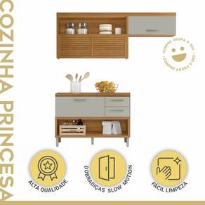 A cozinha Nesher Princesa oferece design contemporâneo e praticidade, com módulos que se adaptam a diferentes espaços e estilos. O armário aéreo de 2,00 m tem porta ripada articulada e montagem Flex, permitindo ajustar a posição do armário de geladeira/depurador.