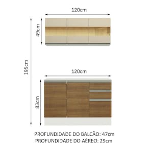 Para completar, o acabamento é em pintura poliéster de alta resistência e fácil limpeza que confere beleza e praticidade. Disponível nas opções totalmente branca ou internamente branca e com as portas em crema e amadeirado Rustic com toque de madeira natural. As medidas totais são: 120 cm de largura e 195 cm de altura; profundidade de 47 cm nos balcões e de 27 cm nos aéreos.
