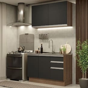 O acabamento da cozinha é no padrão amadeirado Rustic. As portas e frentes são pretas e as partes internas das gavetas e das costas, são brancas. Feito em Pintura Poliéster ecológica, com aplicação de 7 camadas de proteção resistentes a álcool, água e calor.