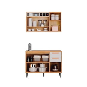 Fabricada em MDP de alta qualidade, a composição conta com: Armário aéreo de 120cm com porta horizontal com pistão a gás, porta vertical e nicho com garrafeiro embutido, perfeito para armazenar utensílios e itens decorativos com fácil acesso; Balcão de 120cm com 3 portas e 2 gavetas, equipado com tampo de 25mm resistente a até 120C, corrediças telescópicas com trava de segurança e pés reguláveis em até 15mm.
