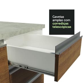Fabricada com itens de qualidade, possui puxadores com perfil total em alumínio, dobradiças que amortecem o fechamento das portas e corrediças telescópicas que permitem a abertura total das gavetas.