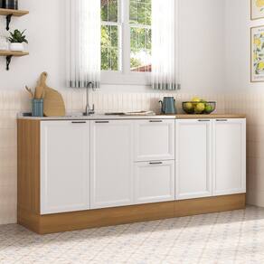 Informações Complementares: Portas de bater almofadadas/molduradas em MDF, balcão 120cm sem tampo ideal para pia que atenda a medida de 120x50cm, balcão 80cm com tampo espessura 27mm, corrediças telescópicas, dobradiças de 35mm, prateleiras internas, puxadores metálicos, pés PVC reg