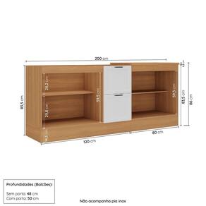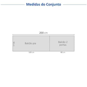 Medida de cada item (A x L x P): Balcão 2 portas 2 gavetas (sem tampo): 83,5cm x 120cm x 50cm; Balcão 2 portas (com tampo): 86cm x 80cm x 50cm.
