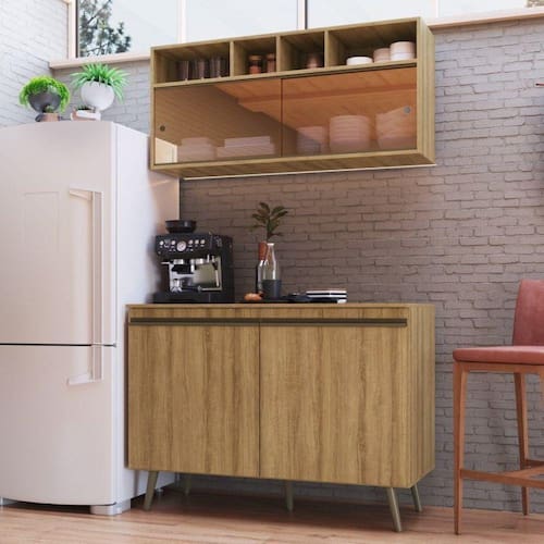 Possui puxador em perfil PVC, corrediça telescópica, dobradiça metálica e pé estilo retrô. Sua estrutura em MDP de 15mm possui acabamento finish foil. Disponíveis nas cores Verde Bellagio, Teka e Cinnamon, tons exuberantes e cheios de energia que colorem trazendo mais vida a sua cozinha. Altura do Conjunto: 200 cm Ambiente: null Ambiente Principal: Cozinha Cor: Teka Informação Complementar: 1x Balcão 2 Portas com Tampo 120 cm One TekaLargura: 120Altura: 87.5Peso: 37.4Profundidade: 52Necessita Montagem: Sim1x Armário Aereo com 2 Portas 120 cm One TekaLargura: 120Altura: 54Peso: 24.9Profundidade: 30Necessita Montagem: Sim Possui Portas: 02 Suporta Até (kg): 05