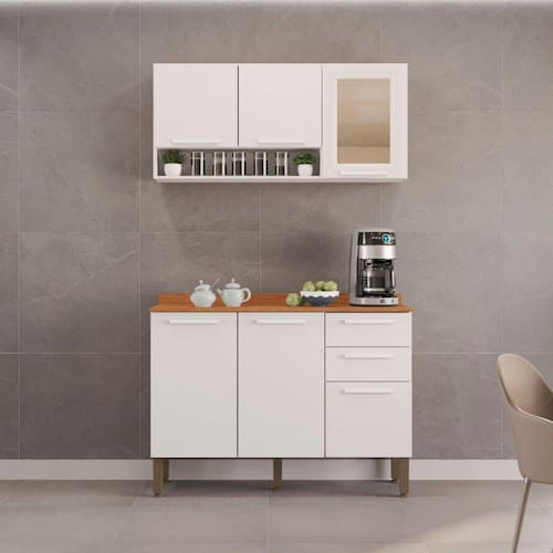 Você nunca imaginou que sua Cozinha pudesse ficar tão organizada. Com este Armário de Cozinha Combo Bella 04 o espaço fica ainda mais convidativo e sempre pronto para preparar pratos incríveis, otimizando o espaço para guardar seus utensílios. Confeccionado com materiais de resistência, qualidade e inovação ele é a melhor opção para completar o ambiente, cores modernas que combinam com tudo que escolher. Acabamento da Prateleira: Pintura Escala de Brilho da Prateleira: Brilhante Acabamento da Gaveta: Pintura UV Escala de Brilho da Gaveta: Brilhante Material do Puxador da Gaveta: MDF Acabamento da Porta: Pintura Escala de Brilho da Porta: Brilhante Material do Puxador da Porta: MDF Acabamento dos Pés: Pintura Acompanha Tampo: Sim Altura dos Pés: 16 Altura Máxima dos Pés: 16.0000 Ambiente Principal: Cozinha codigo_ean: 7909903502716 Complexidade da Montagem: Alta: deve ser montado por um montador especializado Cor: Branco Cor do Produto: Branco Escala de Brilho: Brilhante Espessura do Tampo: 15 mm Gaveta com Chave: Não Itens Inclusos: 1 Armário Aéreo, 1 Balcão, Manual de Montagem e Kit Ferragens. Linha ou Coleção: Bella Manual de Montagem e Instalação: https://product-hub-prd.madeiramadeira.com.br/882231/documents/b026affe-2386-4a48-9c00-f82daf5eef021686609manualvalencia04.pdf Material da Dobradiça/Corrediça da Porta: Metálica Material da Gaveta: MDP Material da Porta: MDP Material da Prateleira: MDP Material do Fundo: MDF Material do Tampo: MDP Material dos Pés: Polipropileno Medida de cada item (A x L x P): Armário Aéreo Reflecta 54,5cmx120cmx26cm; Balcão 85,5cmx120cmx36,5cm modular: Sim Necessita Montagem: Sim O Balcão Acompanha Pia: Não Origem do Produto: Nacional Pés Reguláveis: Sim Peso: 436 kg Peso Máximo por Gaveta: 5 kg Peso Máximo por Prateleira: 5 kg Possui Pés: 06 Possui Portas: Sim Possui Prateleiras: Sim Possui recorte para Cooktop: Não Possui Rodízio: Não Possui Vidro: Sim Produto Montado: Sim Recomendações de Uso, Manutenção e Limpeza: Limpar com flanela limpa e seca. Não usar produtos abrasivos. Sapatas Niveladoras: Sim Sistema de Montagem: Parafusos e cavilhas Tamanho Indicado da Pia: Não possui. Tipo de Corrediça da Gaveta: Metálica Telescópica Tipo de Dobradiça da Porta: 35 mm Tipo de Puxador da Gaveta: Externo Tipo de Puxador da Porta: Externo