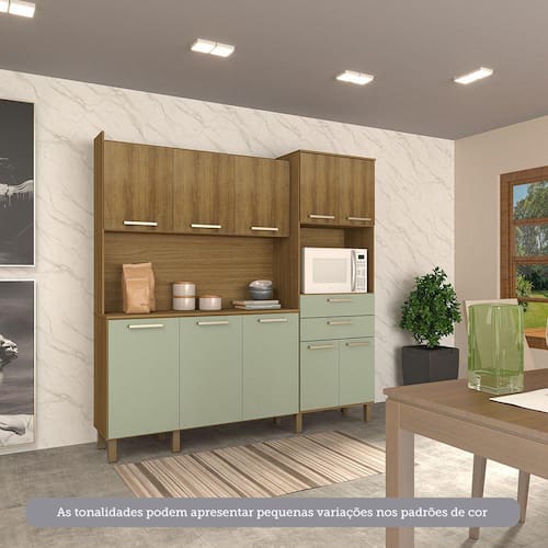 Informações Complementares: Tampo 15mm. Fundos em HDF 3mm. Permite o uso de forno ou micro-ondas. ATENÇÃO: Na utilização de FORNO ELÉTRICO/GÁS é obrigatória a retirada do fundo -risco de super aquecimento-. As dimensões máximas do forno devem respeitar a margem de respiro, necessitando folga de 5cm entre forno e laterais do móvel.