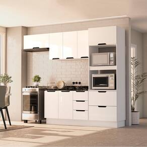 Características: Estrutura MDP Pintura FF/UV 05 Portas Articuladas com Dobradiças Metálicas 03 Portas Basculantes com Pistão à Gás 04 Gavetas com Corrediças Metálicas 02 Nichos para Eletroportáteis Puxadores de Plástico Possui Prateleiras com Amplo Espaço Possui Rodapé Peso Suportado nas Prateleiras Estruturais: 10kg Distribuídos Peso Suportado nas Prateleiras: 5kg Distribuídos Peso Suportado nas Gavetas: 3kg Distribuídos *NÃO ACOMPANHA TAMPO*