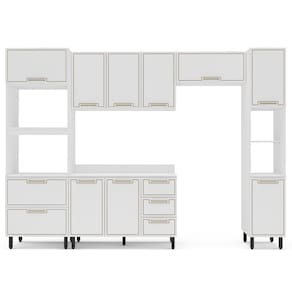 Características: Estrutura MDP Pintura FF/UV 07 Portas com dobradiças metálicas 03 Portas com pistão à gás 04 Gavetas com corrediças telescópicas Puxadores em Alumínio 11 Pés em Plástico Acabamento usinado Possui prateleiras com amplo espaço Peso suportado nas Prateleiras Estruturais: 10kg Peso suportado nas Prateleiras: 5kg Peso suportado nas Gavetas: 3kg *Acompanha Tampo*