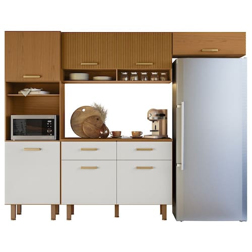 O Armário Aéreo dispõe de duas portas com detalhe em ripado gráfico e dois nichos para temperos e itens decorativos. Para completar, o Armário de Geladeira traz uma porta basculante com pistão a gás, que facilita o manuseio. Com uma prateleira interna, a Cozinha Compacta possui amplo espaço para acomodar utensílios, louças e mantimentos.