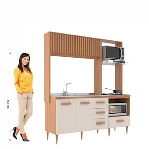 A Cozinha compacta Celine na cor Freijó/off White é composta por 3 gavetas, 04 portas, sendo duas basculantes e duas de bater, suas corrediças e dobradiças são metálicas com pistão a gás na porta superior. Possui Ripado na Porta superior dando um ar moderno ao seu ambiente. Possui 185 cm de comprimento 210 cm de altura e 53 cm de profundidade com pés de 17 cm com regulagem de altura. Possui espaço para forno elétrico e micro-ondas. Com capacidade de instalar depurador de ar e cooktop até 4 bocas (medida limite 60 cm de comprimento)
