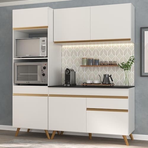 A Cozinha Compacta 3 peças com Armário e Balcão MP3694 Veneza Multimóveis tem um excelente custo benefício e um amplo espaço interno. Produzida em MDP com acabamento acetinado (cerca de 20% de brilho), que garante maior durabilidade e resistência, possui corrediças metálicas (mais leveza no manuseio), pés retrô em polipropileno, que deixam o ambiente mais estiloso, puxadores em ABS e tampo em MDP 15mm com pintura de alta resistência. Os módulos são individuais e você pode montar da maneira que se adaptar melhor ao seu ambiente. O balcão possui tampo removível (compatível com pia de 120 cm). Para deixar sua cozinha mais bonita e organizada, possui módulo para forno e microondas, além de compartimento especial para utensílios mais altos.