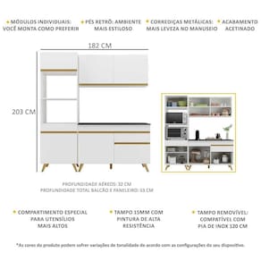 Dimensões do produto montado: Cozinha - Altura: 203cm | Largura: 182cm | Profundidade: 32cm (aéreo) - 53cm (paneleiro e balcão com tampo) *Você pode consultar as medidas internas na imagem técnica do produto.