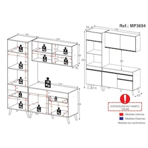 Conteúdo da Embalagem: 1 (um) armário aéreo 120cm 1 (um) balcão com tampo 120cm 1 (um) armário para forno e microondas 62cm