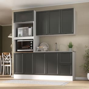 Informações Complementares: Portas de bater almofadadas/molduradas em MDF; pistão a gás na porta basculante; balcão 120cm sem tampo ideal para pia que atenda a medida de 120x50cm; corrediças telescópicas; dobradiças de 35mm; prateleiras internas; puxadores em alumínio; espaço para f