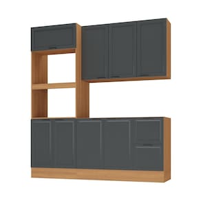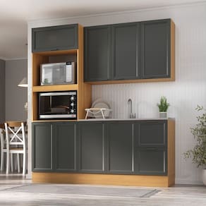 Informações Complementares: Portas de bater almofadadas/molduradas em MDF; pistão a gás na porta basculante; balcão 120cm sem tampo ideal para pia que atenda a medida de 120x50cm; corrediças telescópicas; dobradiças de 35mm; prateleiras internas; puxadores em alumínio; espaço para f