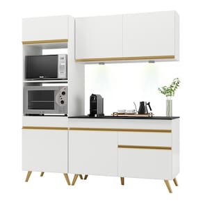 Conteúdo da Embalagem: 1 (um) armário aéreo 120cm 1 (um) balcão com tampo 120cm 1 (um) armário para forno e microondas 62cm 1 (um) kit com 2 Luminárias LED