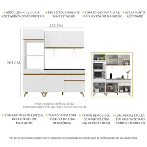 Dimensões do produto montado: Cozinha - Altura: 203cm | Largura: 182cm | Profundidade: 32cm (aéreo) - 53cm (paneleiro e balcão com tampo) *Você pode consultar as medidas internas na imagem técnica do produto.