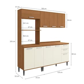 Medida de cada item (A x L x P): Kit Forno: 205x70x52cm/ Aéreo:56x120x31cm/ Balcão:86,5x120x52cm/ Tampo:2,5x120x52cm