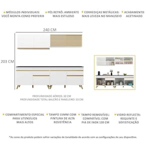 Dimensões do produto montado: Cozinha - Altura: 203cm | Largura: 240cm | Profundidade: 32cm (aéreos) - 53cm (balcão com tampo) *Você pode consultar as medidas internas na imagem técnica do produto.