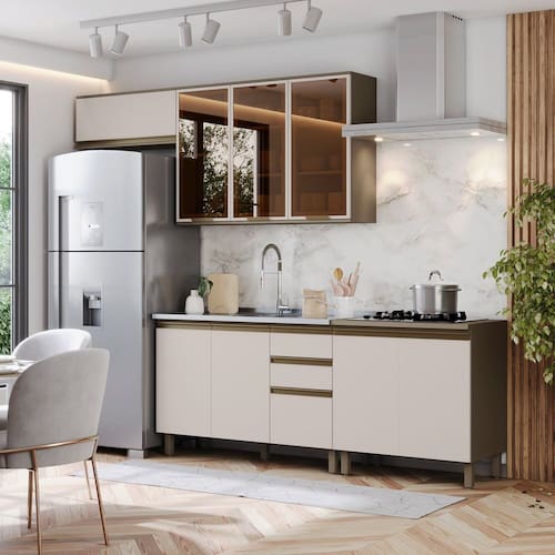 A Cozinha Compacta 4 Peças 100% MDF é uma solução moderna e prática para otimizar o espaço na sua cozinha. Ela é composta por um módulo aéreo para geladeira, um aéreo basculante, um aéreo com três portas de vidro, um balcão para pia e um balcão com duas portas, além de incluir um tampo para cooktop. Os módulos são projetados em MDF, garantindo resistência e durabilidade, enquanto o design compacto e funcional facilita a organização dos utensílios e eletrodomésticos. A presença de portas de vidro adiciona um toque elegante e contemporâneo ao ambiente. Acabamento da Prateleira: Pintura Texturizada UV Escala de Brilho da Prateleira: Fosco Acabamento da Gaveta: Pintura Texturizada UV Escala de Brilho da Gaveta: Fosco Acabamento da Porta: Pintura Texturizada UV Escala de Brilho da Porta: Fosco Acompanha Tampo: Sim Altura dos Pés: 14,5 cm Ambiente Principal: Cozinha Complexidade da Montagem: Média: pode ser montado por mais de uma pessoa e/ou necessite de maior conhecimento para montagem Cor: Duna/Cristal Cor do Produto: Duna/Cristal Cor Interna: Trama Escala de Brilho: Fosco Espessura do Material da Estrutura: 15 mm Espessura do Tampo: 25 mm Gaveta com Chave: Não Itens Inclusos: 1 Cozinha Compacta Connect, Kit Ferragens e Manual de Instruções Linha ou Coleção: Connect - Henn Manual de Montagem e Instalação: https://product-hub-prd.madeiramadeira.com.br/928829/documents/7e2599a9-b23e-4895-a136-499746e46e697e210551243251719582201085.pdf Material da Dobradiça/Corrediça da Porta: Metálica Material da Gaveta: MDF Material da Porta: MDF Material da Prateleira: MDF Material do Fundo: MDF Material do Tampo: MDF/MDP Material dos Pés: ABS Medida de cada item (A x L x P): (A x L x P) Aéreo Basculante: 34 x 80 x 31,5 Cm; Balcão 2 Portas: 82 x 80 x 51 Cm; Balcão Pia: 82 x 120 x 51 Cm; Aéreo 3 Portas de Vidro: 83 x 120 x 31,5 Cm Medida do Recorte para Cooktop: (L x P) 51,5 x 36 Cm modular: Sim Montagem Flex: Sim Necessita Montagem: Sim O Balcão Acompanha Pia: Não Origem do Produto: Nacional Pés Reguláveis: Não Peso: 99,5 kg Peso Máximo por Gaveta: 3 kg Peso Máximo por Prateleira: 8 kg Possui Pés: 09 Possui Portas: Sim Possui Prateleiras: Sim Possui recorte para Cooktop: Sim Possui Rodízio: Não Possui Vidro: Sim Recomendações de Uso, Manutenção e Limpeza: Para limpeza de seu móvel, use uma flanela limpa e seca. Não utilize produtos químicos que possam danificar o produto. Sapatas Niveladoras: Não Sistema de Montagem: Parafusos e Cavilhas Suporta Até (kg): 73 kg Tamanho Indicado da Pia: Não possui Tipo de Corrediça da Gaveta: Telescópica Tipo de Dobradiça da Porta: Soft close Tipo de Puxador da Gaveta: Embutido Tipo de Puxador da Porta: Embutido
