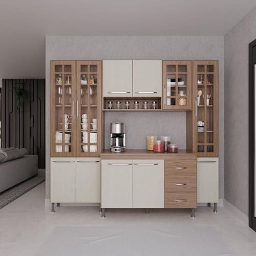 Os módulos são avulsos (cada peça é independente uma da outra) possibilitando assim vários arranjos, o espaço interno, que vem com prateleiras e divisórias, é ótimo para organização dos utensílios e mantimentos. Fabricados em material resistente, como chapas de MDP 15mm, corrediças telescópicas e dobradiças metálicas. Com puxadores cromados em ABS, pés em plástico com regulagem de altura.