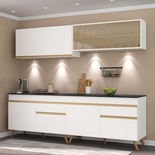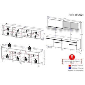 Conteúdo da Embalagem: 1 (um) armário aéreo com portas de vidro 120cm 1 (um) armário aéreo 120cm 2 (dois) balcões com tampo 120cm 1 (um) kit com 4 Luminárias LED
