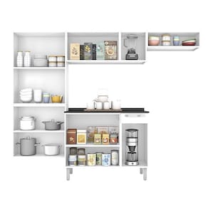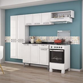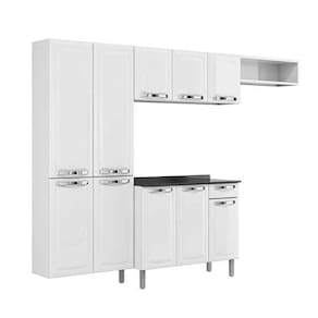 Cozinha Completa Branca Linha Rose. Essa cozinha possui 1 paneleiro duplo com 4 portas, 1 armário aéreo com 3 portas e um Nicho para compor geladeira ou fogão, 1 balcão/gabinete 3 portas e 1 gaveta com prateleiras internas bem divididas. Seus armários com prateleiras internas bem distribuídas acomodam utensílios, mantimentos e panelas de vários tamanhos, além de trazer um charme a mais na sua cozinha. Seus puxadores são em ABS metalizados.