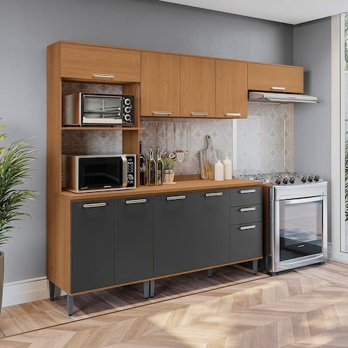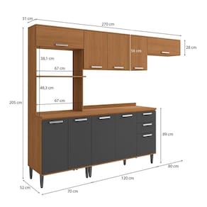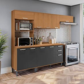 Sua cozinha mais completa com o Combo CB1450 da Cozinha Linna Kappesberg. Produzido em MDP de 15mm, são 2,05m de altura, 2,70m de largura e 52cm de profundidade, com estrutura em pintura touch na cor canela em acabamento fosco. Com pezinhos em polipropileno na cor champanhe, você também poderá montá-lo suspenso, deixando sua cozinha do seu jeito. Versátil e funcional, são quatro peças, entre kit forno e microondas, balcão e aéreo de pia, incluindo o tampo e aéreo basculante, garantindo mais praticidade na organização. O destaque são as dobradiças com amortecimento, corrediças telescópicas e os puxadores em polipropileno na cor onix, que completam a beleza e o design do produto. Acabamento da Prateleira: Pintura Escala de Brilho da Prateleira: Fosco Acabamento da Gaveta: Pintura Escala de Brilho da Gaveta: Fosco Material do Puxador da Gaveta: Plástico Acabamento da Porta: Pintura Escala de Brilho da Porta: Fosco Material do Puxador da Porta: Plástico Acabamento dos Pés: Polipropileno Acompanha Rodapé Decorativo: Não Acompanha Tampo: Sim Altura dos Pés: 17 cm Altura Máxima dos Pés: 17.0000 Ambiente Principal: Cozinha Balcão Suporta Pia: Sim codigo_ean: 7900288346513 Complexidade da Montagem: Média: pode ser montado por mais de uma pessoa e/ou necessite de maior conhecimento para montagem Cor: Canela/Grafite Cor do Produto: Canela/Grafite Escala de Brilho: Fosco Espessura do Material da Estrutura: 15 mm Espessura do Tampo: 25 mm Gaveta com Chave: Não Itens Inclusos: 1 kit cozinha, manual de montagem e ferragens Linha ou Coleção: Cozinha Linna Manual de Montagem e Instalação: https://product-hub-prd.madeiramadeira.com.br/215531365/documents/a89eac56-e83c-4c03-8045-62f6f33d8feb343036454451772637774092.pdf Marca: Kappesberg Material da Corrediça: Metálica Material da Dobradiça/Corrediça da Porta: Metálica Material da Gaveta: MDP Material da Porta: MDP Material da Prateleira: MDP Material do Tampo: MDP Material dos Pés: Polipropileno Medida de cada item (A x L x P): Kit Forno: 205x70x52cm/ Aéreo:56x120x31cm/ Balcão:86,5x120x52cm/ Aéreo:28x80x31cm/ Tampo:2,5x120x52cm modular: Sim Necessita Montagem: Sim O Balcão Acompanha Pia: Não Origem do Produto: Nacional Pés Reguláveis: Sim Peso: 120,7457 kg Peso Máximo por Gaveta: 6 kg Peso Máximo por Prateleira: 7 kg Possui Pés: 09 Possui Portas: Sim Possui Prateleiras: Sim Possui recorte para Cooktop: Não Possui Rodízio: Não Produto Montado: Sim Recomendações de Uso, Manutenção e Limpeza: Use um pano limpo e ligeiramente umedecido em água ou álcool (recomendamos álcool etílico hidratado). Logo após, seque a superfície com um pano seco e macio. Em grandes superfícies limpe pequenas áreas de cada vez, trabalhando de baixo para cima. Sapatas Niveladoras: Não Sistema de Montagem: Parafuso Philips Suporta Até (kg): 40 kg Tamanho Indicado da Pia: 120x52 Tamanho Indicado do Tampo ou Pia: 120x52 Tipo de Corrediça da Gaveta: Metálica Telescópica Tipo de Dobradiça da Porta: 35 mm Tipo de Puxador da Gaveta: Externo Tipo de Puxador da Porta: Externo