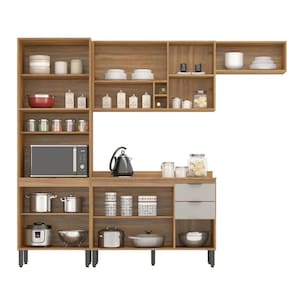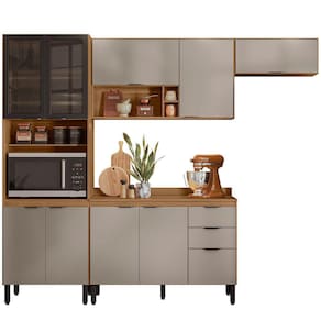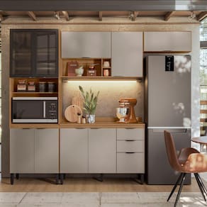 Cozinha compõe: 1 Paneleiro 4 portas sendo com 2 portas de vidro fume ambos com espaço para forno de até 44L 1 Aéreo de geladeira 70cm porta basculante com pistão a gás, 1 Aéreo 2 portas e nicho 1 Balcão 120cm com 3 portas e 2 gavetas com tampo que pode ser substituído por pia.