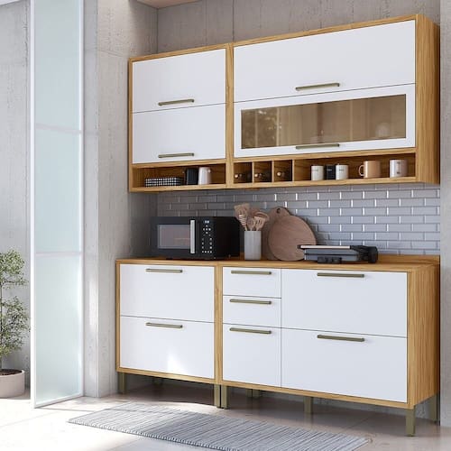Medida Geral do Ambiente (A x L x P): 220 x 200 x 47 Acabamento da Prateleira: Pintura UV Escala de Brilho da Prateleira: Semi-Brilho Acabamento da Gaveta: Pintura UV Escala de Brilho da Gaveta: Brilhante Material do Puxador da Gaveta: Alumínio Acabamento da Porta: Pintura UV Escala de Brilho da Porta: Brilhante Material do Puxador da Porta: Alumínio Acompanha Tampo: Sim Altura dos Pés: 17 cm Altura Máxima dos Pés: 17.0000 Ambiente Principal: Cozinha Balcão Suporta Pia: Não codigo_ean: 7900288162519 Complexidade da Montagem: Alta: deve ser montado por um montador especializado Cor: Branco Brilho/Amêndoa Cor do Produto: Branco Brilho/Amêndoa Cor Flex: Não Cor Interna: Amêndoa Escala de Brilho: Semi-Brilho Gaveta com Chave: Não Informações Complementares: Detalhes em Vidro Reflecta. Portas basculantes com pistão à gás. Acompanha tampo. Itens Inclusos: 1 Cozinha, Manual de Montagem e Kit Ferragens Linha ou Coleção: Vicenza Manual de Montagem e Instalação: https://product-hub-prd.madeiramadeira.com.br/687816592/documents/a2e75ceb-222f-433a-9edf-48694e5d924e2960430366617484577595957.pdf Marca: Espresso Móveis Material da Corrediça: Metálica Material da Dobradiça/Corrediça da Porta: Metálica Material da Gaveta: MDF Material da Porta: MDF Material da Prateleira: MDF Material do Fundo: HDF Material do Tampo: MDF Material dos Pés: Plástico Medida de cada item (A x L x P): Armário aéreo 80 Duplo - 90cm x 80cm x 33,50cm Armário aéreo 120cm - 90cm x 120cm x 33,50cm Balcão 80 1P1G - 90cm x 80cm x 47cm Balcão 120 2P3G - 90cm x 120cm x 47cm modular: Sim Necessita Montagem: Sim O Balcão Acompanha Pia: Não Origem do Produto: Nacional Pés Reguláveis: Sim Peso: 143,59 kg Peso Máximo por Gaveta: 5 kg Peso Máximo por Prateleira: 5 kg Possui Pés: 09 Possui Portas: Sim Possui Prateleiras: Sim Possui recorte para Cooktop: Não Possui Rodízio: Não Possui Vidro: Sim Produto Montado: Sim Recomendações de Uso, Manutenção e Limpeza: Para limpeza utilize somente pano limpo e macio, ligeiramente umidecido em água (apenas o bastante para remover a poeira), seguido de um pano seco. Sapatas Niveladoras: Sim Sistema de Montagem: Parafusos altoatarraxantes, conjuntos minifix, cavilha madeira, acessórios plásticos/metálicos Suporta Até (kg): 110 kg Tamanho Indicado da Pia: Não é recomendado o uso de pia. Tipo de Corrediça da Gaveta: Metálica Telescópica Tipo de Dobradiça da Porta: Simples Tipo de Puxador da Gaveta: Externo Tipo de Puxador da Porta: Externo