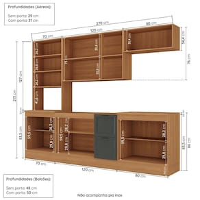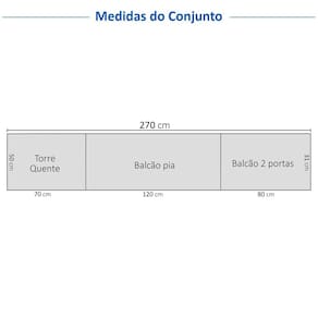 Medida de cada item (A x L x P): Paneleiro Duplo: 213cm x 70cm x sup 31cm/inf 50cm; Aéreo triplo: 76cm x 120cm x 31cm; Aéreo basculante: 34,4cm x 80cm x 31cm; Balcão 2 portas 2 gavetas (sem tampo): 83,5cm x 120cm x 50cm; Balcão 2 portas (com tampo): 86cm x 80cm x 50cm.