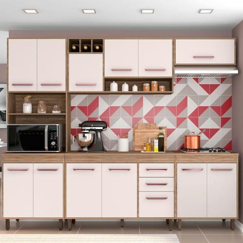Características: Material: MDP Pintura UV Portas de bater Porta basculante Prateleiras Nicho micro-ondas Nicho adega Nichos decorativos Pistão a gás Corrediças metálicas Dobradiças de 26mm Puxadores em polímero Pés reguláveis 13 Portas 2 Gavetas