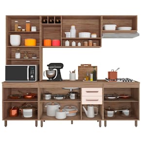 A Cozinha Compacta 5 Peças 13 Portas 2 Gavetas com balcão tampo Barcelona da Poliman Móveis é um produto para quem deseja praticidade e funcionalidade, possui design moderno com portas embutidas, e altura diferenciada de 2,18m, o paneleiro possui 4 portas de bater, prateleiras internas e nicho para micro-ondas, aéreo 120cm com 3 portas, nicho decorativo e nicho adega para 3 garrafas dando um charme a peça. O aéreo geladeira 70cm possui porta basculante com pistão a gás permitindo uma abertura mais suave que mantém a porta suspensa podendo ser utilizado sobre a geladeira ou fogão. Acompanha balcão com tampo 15mm 3 portas 2 gavetas que pode ser utilizado para pia de 120x50cm -pia vendida separadamente-, e balcão 2 portas com tampo de 15mm que pode ser utilizado para acomodar cooktop -instruções do recorte do tampo no manual de montagem-, prateleira interna removível para acomodar botijão de gás e utensílios maiores. Produto com dobradiças reforçadas de 26mm nas portas, puxadores modernos em polímero bronze, pés em PVC reguláveis ao piso de 17cm que permitem o nivelamento perfeito. Estrutura de caixaria em MDP Perffect Touch de maior resistência e com proteção Bacterban que inibe a proliferação de fungos e bactérias na superfície do móvel e portas em MDP com pintura UV brilho. Produto ecologicamente correto com embalagens preparadas para evitar avarias e permitir que o produto chegue em perfeito estado em sua casa. Perfeita combinação com os mais variados ambientes. Qualidade que só a Poliman oferece em seus produtos.