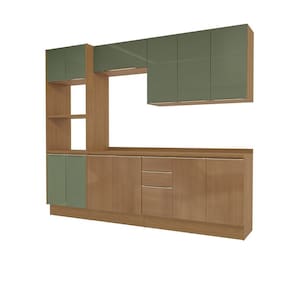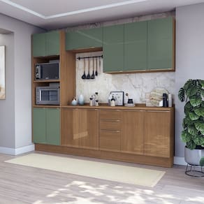 Sua cozinha completa com o Combo CB1475 da Cozinha Vibra Kappesberg. Com estrutura em MDP de 15mm e portas em MDF de 18mm, são 2,30m de altura, 2,70m de largura e 52cm de profundidade, com estrutura em pintura touch na cor canela, frentes variam entre o canela nos balcões e verde pistache nos aéreos, ambos em pintura super brilho. Com rodapés, o combo acompanha as ferragens para ser montado suspenso. Outra possibilidade é montá-lo com pezinhos, adquiridos separadamente. Versátil, combinando cinco peças, entre kit forno e micro-ondas, balcões, aéreos e tampos, garante amplo espaço de armazenamento. O destaque fica para as dobradiças com amortecimento, as corrediças telescópicas e os puxadores metálicos na cor gold com ponteiras em polipropileno, completando a beleza e o design do produto.