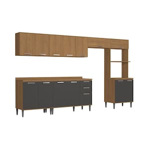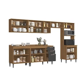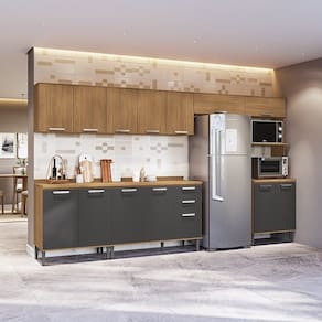 Sua cozinha mais completa com o Combo CB1455 da Cozinha Linna Kappesberg. Produzido em MDP de 15mm, são 2,05m de altura, 3,50m de largura e 52cm de profundidade, com estrutura em pintura touch na cor canela, e as frentes, variam entre o canela nos aéreos e grafite nos balcões, ambos em acabamento fosco. Com pezinhos em polipropileno na cor champanhe, você também poderá montá-lo suspenso, deixando sua cozinha do seu jeito. Versátil, são seis peças que se adaptam a todos os espaços, unindo o kit forno e microondas, balcões, aéreos e tampos e o basculante, garantindo praticidade na organização. O destaque fica para as dobradiças com amortecimento, corrediças telescópicas e os puxadores em polipropileno na cor onix, que completam a beleza do produto.