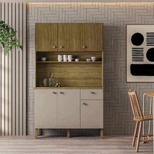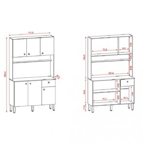 Produzido em MDP de 12mm e 15 mm 6 portas 1 gaveta Prateleira interna Dobradiças e corrediças telescópicas 100 metálicas Puxador ergonômico em poliestireno Pés reguláveis em polipropileno Acabamento em pintura com secagem em luzes UV.
