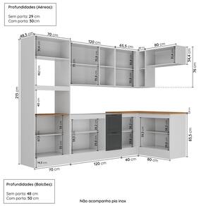 Medida de cada item (A x L x P): Torre Quente: 213cm x 70cm x 50cm; Aéreo triplo: 76cm x 120cm x 31cm; Aéreo canto: 76cm x 95cm x 31cm; Aéreo Geladeira: 34cm x 80cm x 31cm; Balcão: 84cm x 120cm x 50cm; Balcão canto: 86cm x 95cm x 50cm; Balcão 80cm: 86cm x 80cm x 50cm; Tampo: 2,7cm x 80cm x 50cm.