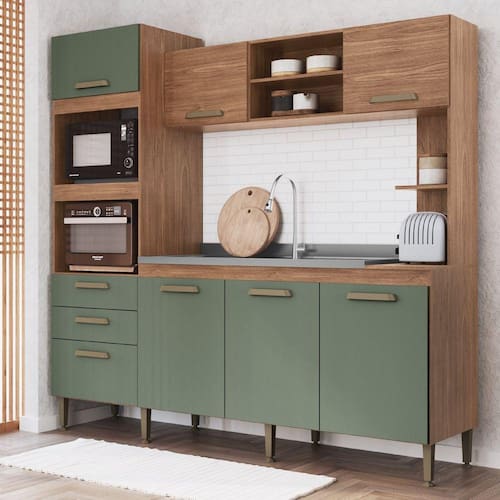 A cozinha Melyna é um produto com excelente qualidade, produzido em MDP de fácil montagem, portas fixadas com dobradiças metálicas e gaveta com corrediças metálicas. Possui espaço para dois fornos, facilitando a organização dos seus utensílios em geral, possui também pés com regulagem de altura deixando assim sua casa com um ambiente mais moderno e aconchegante. Acabamento da Prateleira: Verniz Escala de Brilho da Prateleira: Semi-Brilho Acabamento da Gaveta: Verniz Escala de Brilho da Gaveta: Semi-Brilho Material do Puxador da Gaveta: Poliestireno Acabamento da Porta: Verniz Escala de Brilho da Porta: Semi-Brilho Material do Puxador da Porta: Poliestireno Acabamento dos Pés: Pintura Acompanha Tampo: Não Altura dos Pés: 17 Altura Máxima dos Pés: 1700000000.0000 Ambiente Principal: Cozinha codigo_ean: 7909903124024 Complexidade da Montagem: Média: pode ser montado por mais de uma pessoa e/ou necessite de maior conhecimento para montagem Cor: Freijó/Oliva Cor do Produto: Freijó/Oliva Cor Interna: Freijó Escala de Brilho: Semi-Brilho Gaveta com Chave: Não Itens Inclusos: 1 Cozinha Compacta, Kit Ferragens e Manual de Montagem Manual de Montagem e Instalação: https://product-hub-prd.madeiramadeira.com.br/795271/documents/8d1e63ce-2da5-4936-ab69-c40bcc8d1f011040047cz6672melyna110722.pdf Material da Dobradiça/Corrediça da Porta: Metálica Material da Gaveta: MDP Material da Porta: MDP Material da Prateleira: MDP Material do Fundo: HDF Material dos Pés: Polipropileno Necessita Montagem: Sim O Balcão Acompanha Pia: Não Origem do Produto: Nacional Pés Reguláveis: Sim Peso: 104,2 kg Peso Máximo por Gaveta: 3 kg Peso Máximo por Prateleira: 4 kg Possui Pés: 08 Possui Portas: Sim Possui Prateleiras: Sim Possui recorte para Cooktop: Não Possui Rodízio: Não Produto Montado: Sim Recomendações de Uso, Manutenção e Limpeza: Para limpeza utilize pano macio levemente umedecido em água seguido de pano seco. Sapatas Niveladoras: Não Sistema de Montagem: Parafusos, cavilhas e cantoneiras Suporta Até (kg): 40 kg Tamanho Indicado da Pia: 120cm x 54cm Tamanho Indicado do Tampo: 120cm x 54cm Tamanho Indicado do Tampo ou Pia: 120cm x 54cm Tipo de Corrediça da Gaveta: Metálica Simples Tipo de Dobradiça da Porta: Simples Tipo de Puxador da Gaveta: Externo Tipo de Puxador da Porta: Externo