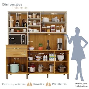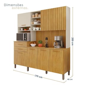Transforme o estilo e a funcionalidade da sua cozinha com o Kitão Lagos. Este móvel é a combinação ideal de praticidade e elegância, projetado para atender às suas necessidades diárias. Com 2 gavetas que possuem corrediças telescópicas e 7 portas, incluindo um espaço específico para o micro-ondas, o Kitão Lagos oferece amplo armazenamento para todos os seus utensílios de cozinha. A pintura UV de alta qualidade proporciona um acabamento durável e resistente, enquanto os pés ajustáveis garantem estabilidade e adaptabilidade ao seu espaço. Com 2 prateleiras internas, você pode organizar seus itens de maneira eficiente. Acabamento da Prateleira: Pintura UV Escala de Brilho da Prateleira: Semi-Brilho Acabamento da Gaveta: Pintura UV Acabamento da Porta: Pintura UV Escala de Brilho da Porta: Semi-Brilho Acompanha Tampo: Sim Ambiente Principal: Cozinha Balcão Suporta Pia: Não codigo_ean: 7900288121202 Complexidade da Montagem: Alta: deve ser montado por um montador especializado Cor: Cinamomo / Off White Acetinado Cor do Produto: Cinamomo / Off White Acetinado Escala de Brilho: Semi-Brilho Gaveta com Chave: Não Itens Inclusos: 1 Cozinha, Manual de Montagem e Kit Ferragens. Manual de Montagem e Instalação: https://product-hub-prd.madeiramadeira.com.br/976815864/documents/3db2cbe1-8ea9-4329-9385-341876103d132855263493817447372267517.pdf Marca: CHF Material da Dobradiça/Corrediça da Porta: Metálica Material da Gaveta: MDP Material da Porta: MDP Material da Prateleira: MDP Material do Tampo: MDP Material dos Pés: Polipropileno modular: Não Necessita Montagem: Sim O Balcão Acompanha Pia: Não Origem do Produto: Nacional Pés Reguláveis: Sim Peso: 86,1 kg Peso Máximo por Gaveta: 3 kg Peso Máximo por Prateleira: 5 kg Possui Pés: 07 Possui Portas: Sim Possui Prateleiras: Sim Possui recorte para Cooktop: Não Possui Rodízio: Não Produto Montado: Sim Recomendações de Uso, Manutenção e Limpeza: Limpeza com pano macio e levemente umedecido. Não utilizar solventes a base e de inflamáveis. Não utilizar produtos abrasivos. Sapatas Niveladoras: Não Sistema de Montagem: Parafusos e cavilhas Tamanho Indicado da Pia: 40 x 40 Tipo de Corrediça da Gaveta: Metálica Telescópica Tipo de Dobradiça da Porta: 35 mm Tipo de Puxador da Gaveta: Externo Tipo de Puxador da Porta: Externo