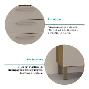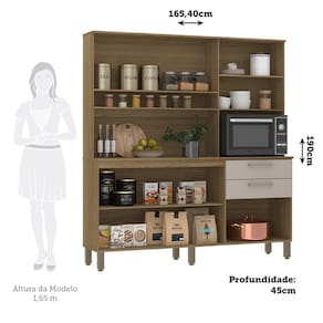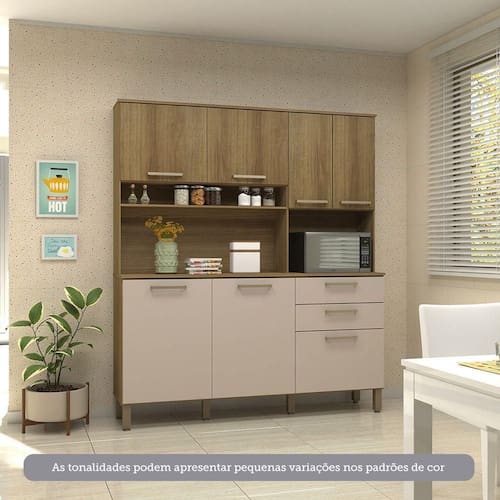 Informacoes Complementares: Tampo 15mm. Fundos em HDF 3mm. Permite o uso de forno ou micro-ondas. ATENCAO: Na utilizacao de FORNO ELETRICO GAS e obrigatoria a retirada do fundo risco de super aquecimento. As dimensoes maximas do forno devem respeitar a margem de respiro, necessitando folga de 5cm entre forno e laterais do movel.