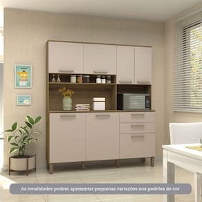Informacoes Complementares: Tampo 15mm. Fundos em HDF 3mm. Permite o uso de forno ou micro-ondas. ATENCAO: Na utilizacao de FORNO ELETRICO GAS e obrigatoria a retirada do fundo risco de super aquecimento. As dimensoes maximas do forno devem respeitar a margem de respiro, necessitando folga de 5cm entre forno e laterais do movel.
