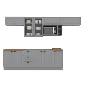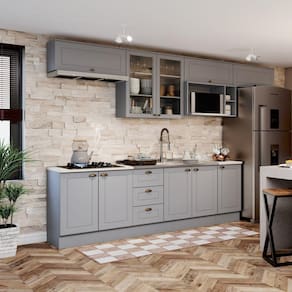 Itens Inclusos: 1 Balcão 3 Gavetas 2 Portas sem Tampo, 3 Aéreos 1 Porta Basculante, Balcão 2 Portas com Tampo para Cooktop, Balcão 1 Porta com Tampo, 1 Aéreo 2 Portas com Vidro, 1 Aéreo Microondas, Kit Ferragens e Manual de Montagem.