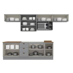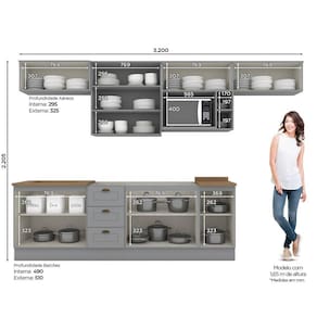 Medida de cada item (A x L x P): 1 Balcão Pia sem Tampo 82x120x51cm | 3 Aéreos 34x80x32,5cm | 1 Balcão com Tampo 82x80x51cm | 1 Balcão com Tampo 82x40x51cm | 1 Aéreo 83x80x32,5cm | 1 Aéreo Microondas 44x80x47,5cm.