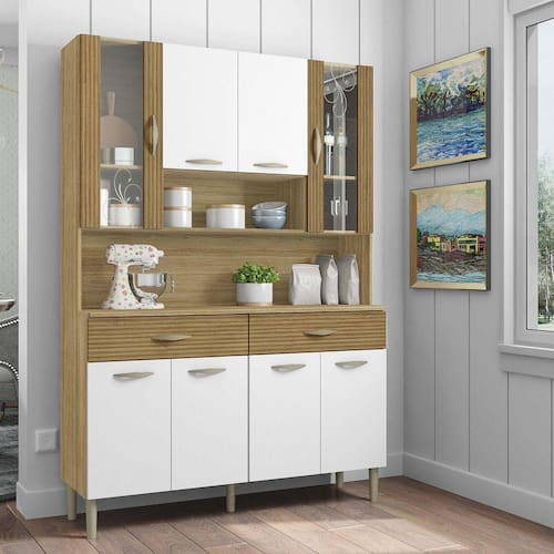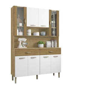 Características: Produzido em MDP de 12mm e 15 mm, 8 Portas - sendo duas portas superiores com vidro, dobradiças e corrediças metálicas, 2 Gavetas, Puxadores ergonômicos em plástico resistente poliestireno, pés fixo em plástico resistente polipropileno.