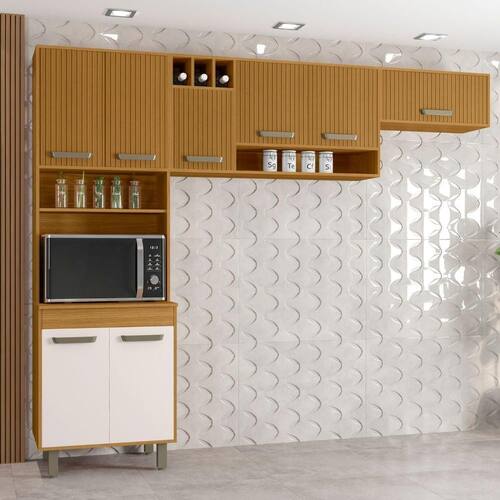Cozinha Compacta 8 Portas e Nichos Malta Freijó/off Ripado Poliman Móveis Móveis -Modernidade e Funcionalidade