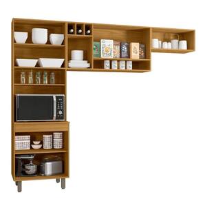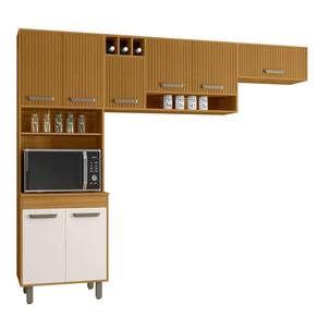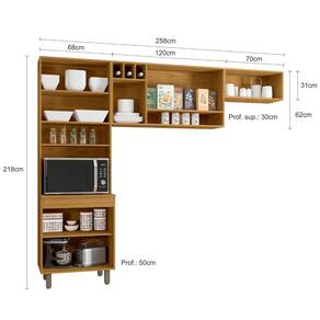Com 218 cm de altura, o paneleiro duplo possui 4 portas com dobradiças reforçadas de 26 mm, prateleiras internas e um nicho funcional para micro-ondas (42 x 65 x 50 cm). O aéreo de 120 cm conta com 3 portas, nicho decorativo (23,5 x 65 x 18 cm) e adega para 3 garrafas. Já o aéreo geladeira traz porta basculante com pistão a gás, que permite abertura suave e pode ser utilizado sobre a geladeira ou fogão.