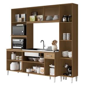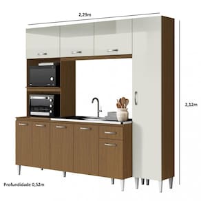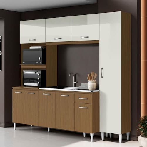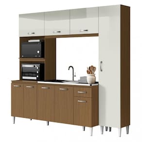 Cozinha Compacta 9 Portas 1 Gaveta sem Tampo Aramóveis, Fabricado com MDP e MDF, o móvel é projetado para ser resistente e durável. Seu interior espaçoso proporciona robustez adicional. As portas contam com puxadores de plástico que oferecem maior resistência, enquanto a gaveta ampla tem uma corrediça de metal para uma fixação mais segura. As dobradiças metálicas aumentam a durabilidade ao abrir e fechar as portas. O acabamento é feito com verniz texturizado fosco e verniz brilhante nas portas, o que não só conserva a beleza do móvel.